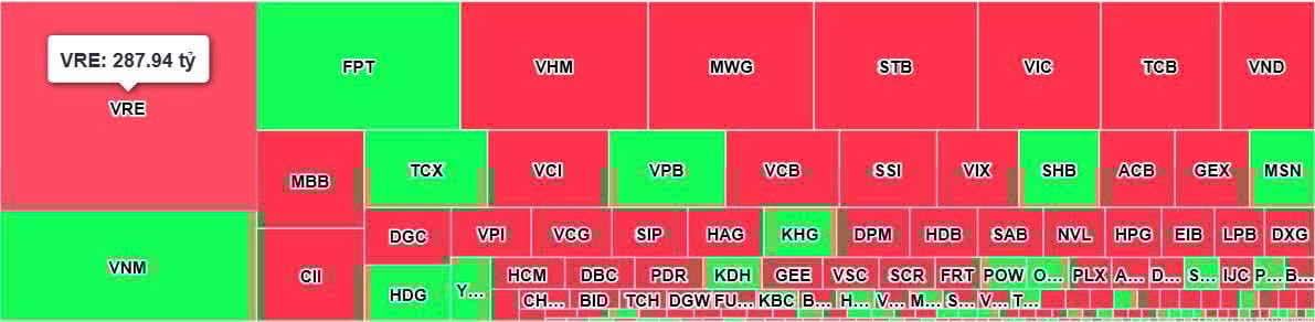 Ngược lại, áp lực bán ròng tập trung mạnh vào nhóm bluechips. VRE dẫn đầu với giá trị bán ròng hơn 288 tỷ đồng, nối dài chuỗi phiên chịu áp lực xả mạnh.