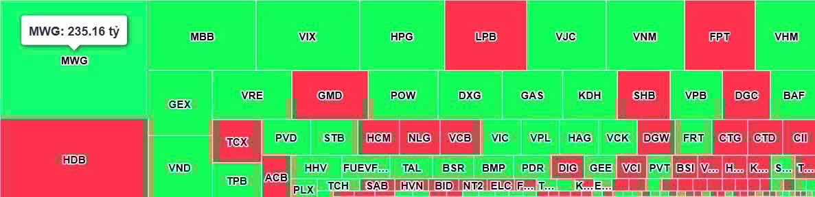 Trên sàn HoSE, khối ngoại mua ròng xấp xỉ 721 tỷ đồng, trở thành động lực chính của dòng vốn ngoại trong phiên. Ở chiều mua, MWG là cổ phiếu được gom ròng mạnh nhất với giá trị khoảng 235 tỷ đồng, cho thấy sự quan tâm trở lại đối với nhóm bán lẻ.