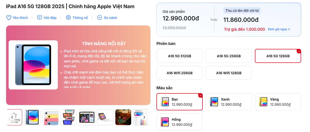 Trong bối cảnh giá các mẫu iPad cao cấp ngày càng tăng, sự xuất hiện của iPad A16 5G phiên bản 128GB với mức giá khoảng 12,99 triệu đồng đang thu hút sự quan tâm lớn từ người dùng Việt. Đây được xem là mẫu iPad 5G "dễ mua" nhất trong hệ sinh thái Apple năm 2025, đặc biệt phù hợp với học sinh, sinh viên và người dùng phổ thông cần một thiết bị màn hình lớn, hiệu năng mạnh nhưng không quá đắt đỏ.