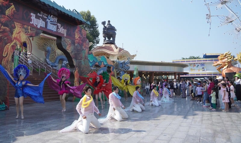 Trong suốt 4 ngày nghỉ lễ, Suối Tiên còn tổ chức chuỗi chương trình nghệ thuật đặc sắc hoàn toàn miễn phí phục vụ du khách. Nổi bật là vở diễn truyền thuyết “Sơn Tinh - Thủy Tinh” được dàn dựng công phu, cùng các tiết mục xiếc chú hề, xiếc múa lửa hấp dẫn. Các hoạt động được thiết kế hướng đến không khí gia đình, mang lại những khoảnh khắc vui tươi, ấm áp và đầy hứng khởi trong những ngày đầu năm mới.