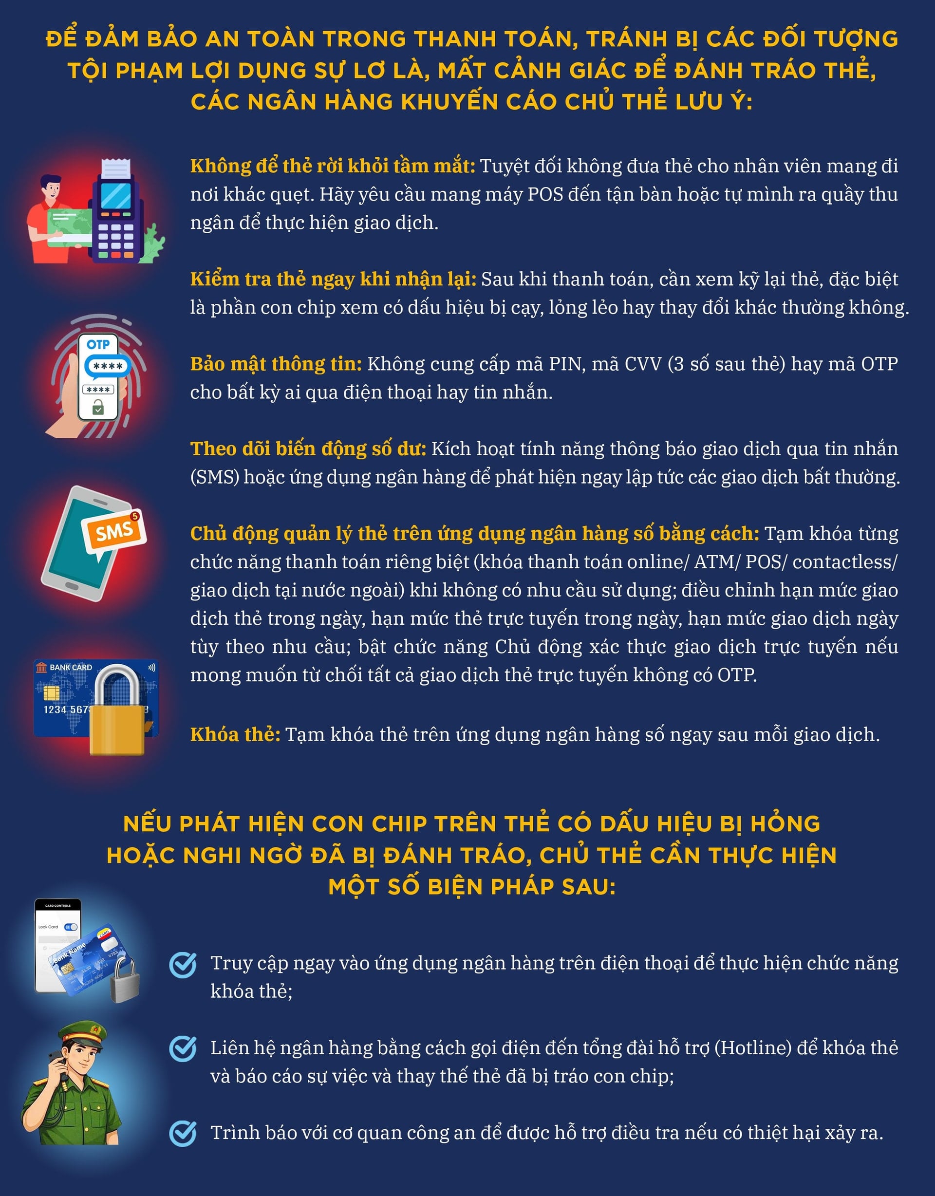 Các ngân hàng như Ngân hàng TMCP Quốc Tế (VIB), Ngân hàng TMCP Kỹ thương Việt Nam (Teccombank); Ngân hàng TMCP Bảo Việt (BAOVIET Bank)… cũng đưa ra các cảnh báo tương tự về thủ đoạn tội phạm mới và nguy hiểm trong lĩnh vực thanh toán thẻ. Điểm chung trong cảnh báo của các ngân hàng đều cho biết: Lợi dụng sơ hở trong quá trình thanh toán thẻ tại nơi mua hàng, đối tượng tráo chip thật của thẻ bằng chip giả. Hành vi này diễn ra rất nhanh và tinh vi, khiến khách hàng dù vẫn giữ thẻ trong tay nhưng thực tế chip thật đã bị mất và bị kẻ gian sử dụng để thực hiện các giao dịch gian lận.