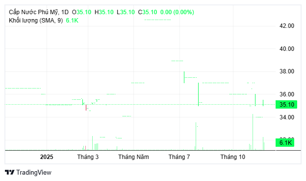 Tại thời điểm gần nhất, cổ phiếu đóng cửa ở mức 35.100 đồng, không thay đổi so với phiên trước với khối lượng giao dịch chỉ khoảng 6.100 cổ phiếu, cho thấy thanh khoản khá thấp - điều phổ biến với các mã nước địa phương. Diễn biến giá đi ngang trong biên độ hẹp cho thấy nhà đầu tư đang nắm giữ dài hạn hơn là đầu cơ ngắn hạn
