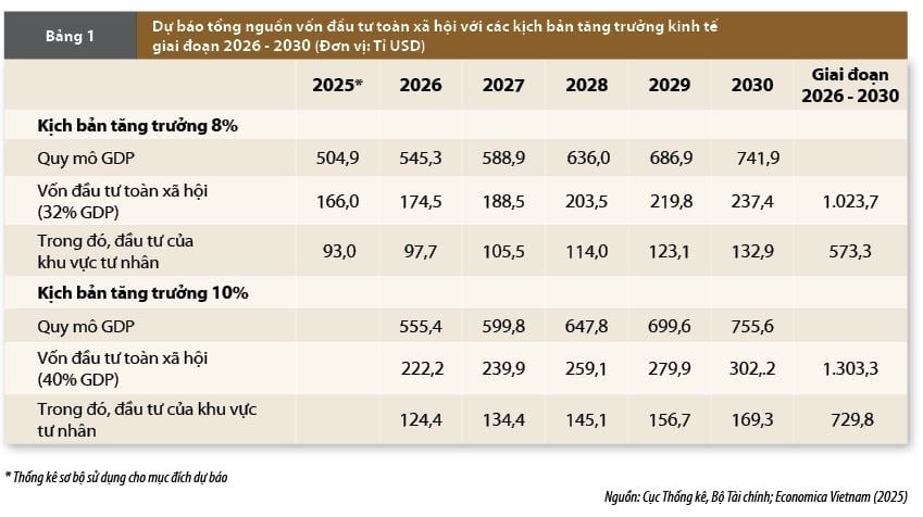 Để đạt mức tăng trưởng kinh tế cao và bền vững trong giai đoạn 2026 - 2030, Việt Nam cần một nguồn lực tài chính khổng lồ và sự thay đổi mang tính đột phá trong cơ cấu huy động vốn. Theo Bộ Tài chính, để đạt mức tăng trưởng GDP 10% mỗi năm trong giai đoạn 2026 - 2030, quy mô vốn đầu tư toàn xã hội cần đạt khoảng 40% GDP. Cũng theo Cục Thống kê (Bộ Tài chính), đầu tư của khu vực kinh tế tư nhân trong nước hiện chiếm khoảng 56% tổng nguồn vốn đầu tư toàn xã hội. Với quy mô GDP đạt khoảng 504 tỉ USD vào năm 2025, Việt Nam ước tính cần khoảng 1.303 tỉ USD vốn đầu tư cho cả giai đoạn để đảm bảo kịch bản tăng trưởng hai con số. (Bảng 1)