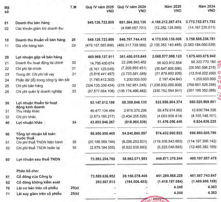 margin: 15px auto;" />Trong quý IV/2025, Thiên Long ghi nhận doanh thu thuần đạt khoảng 949 tỷ đồng, tăng 12% so với cùng kỳ năm trước. Lợi nhuận sau thuế thuộc về cổ đông công ty mẹ đạt 74 tỷ đồng, tăng tới 89% so với quý IV/2024.
