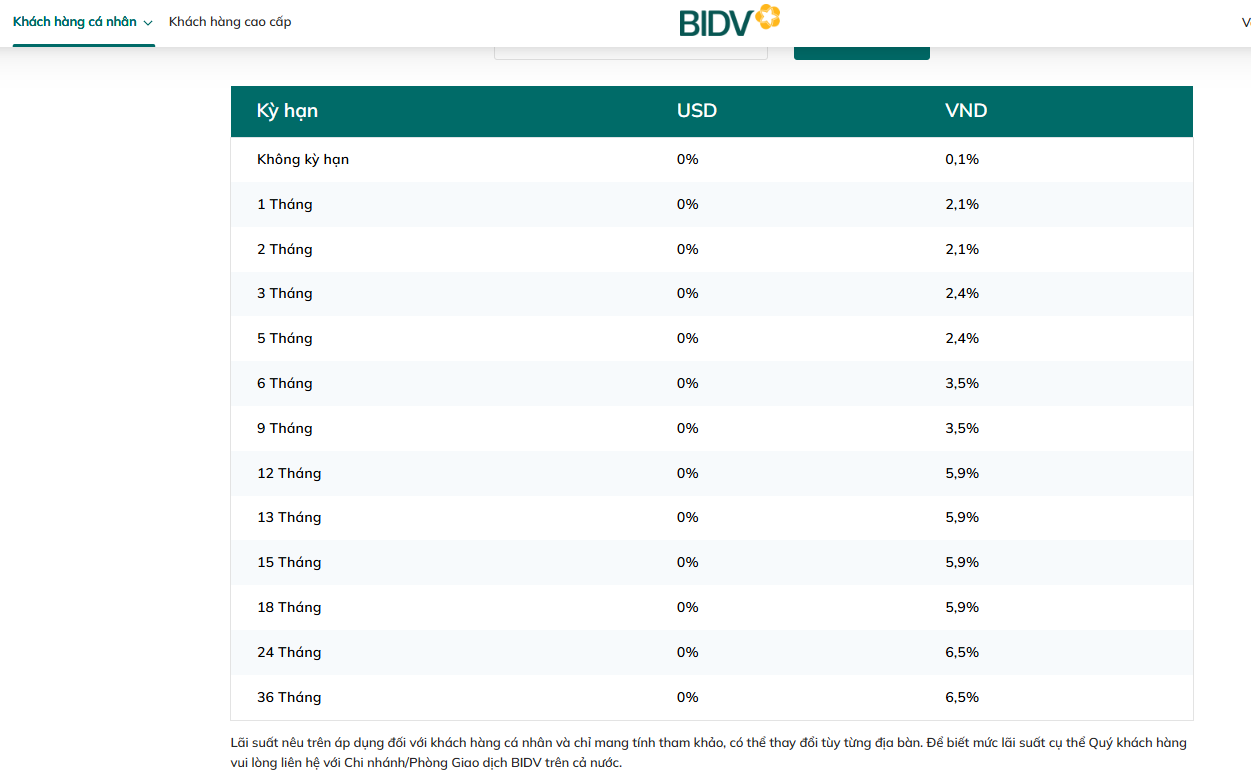 Kỳ hạn 24 - 36 tháng có lãi suất huy động là 6,5%/năm. Đây cũng là mức lãi suất huy động cao nhất tại BIDV.