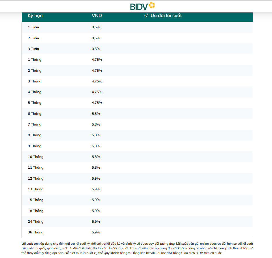 Với hình thức tiền gửi trực tuyến, BIDV áp dụng mức lãi suất huy động từ 0,5 - 5,9%/năm/tùy kỳ hạn, cụ thể: Các kỳ hạn 1 - 3 tuần có lãi suất huy động là 0,5%/năm; kỳ hạn 1-5 tháng có lãi suất là 4,75%/năm; kỳ hạn 7-11 tháng có lãi suất huy động là 5,8%/năm; kỳ hạn 12-36 tháng có lãi suất huy động là 5,9%/năm.