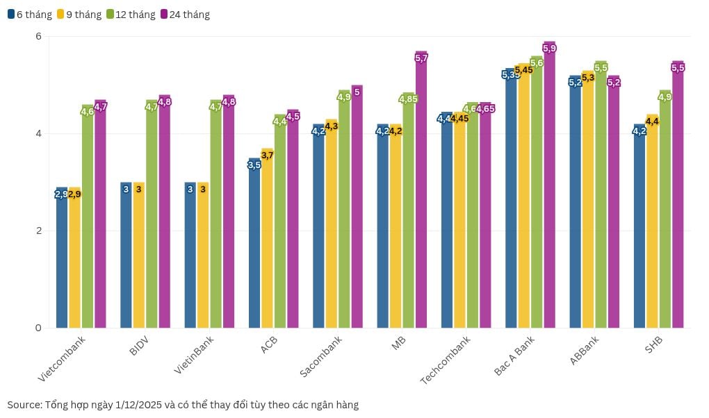 THỐNG KÊ LÃI SUẤT TIẾT KIỆM THÁNG 12/2025 TẠI MỘT SỐ NGÂN HÀNG:
