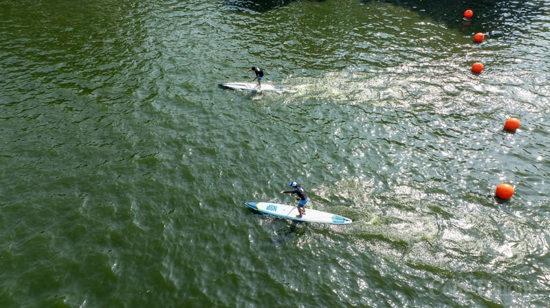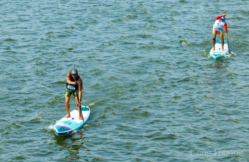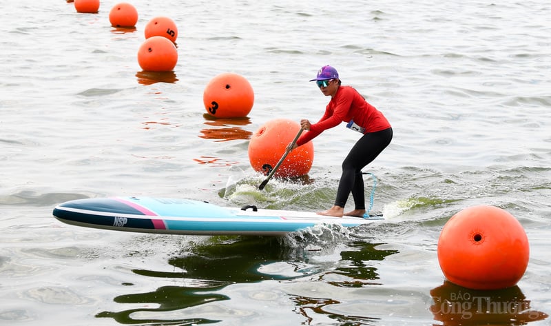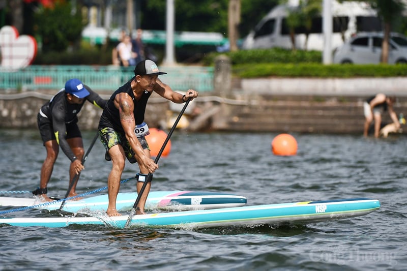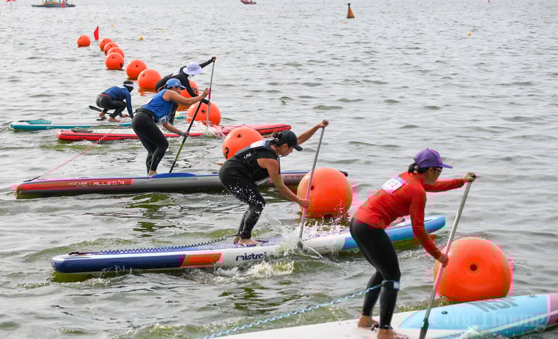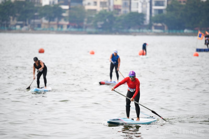 Các VĐV tập trung điều khiển ván SUP trên mặt nước Hồ Tây.