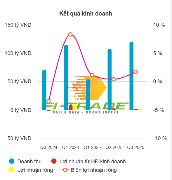 Về hoạt động kinh doanh, báo cáo tài chính quý III/2025 cho thấy Viettronics ghi nhận doanh thu 120 tỷ đồng, tăng 42% so với cùng kỳ năm trước và lợi nhuận sau thuế đạt 2 tỷ đồng, đảo chiều từ khoản lỗ 2,5 tỷ đồng cùng kỳ 2024. Lũy kế 9 tháng đầu năm, doanh nghiệp đạt doanh thu 281 tỷ đồng, lợi nhuận sau thuế 2,6 tỷ đồng, trong khi cùng kỳ năm ngoái lỗ hơn 10 tỷ đồng.