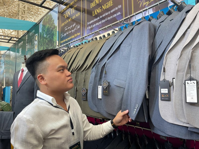 Trong không gian hội chợ, gian hàng của Hợp tác xã may làng nghề Vân Từ (xã Chuyên Mỹ, Hà Nội) thu hút nhiều khách ghé thăm bởi sự tinh tế của những sản phẩm được may thủ công tỉ mỉ. Anh Nguyễn Văn Trung, đại diện Hợp tác xã chia sẻ: “Làng nghề Vân Từ có hơn 85 năm hình thành và phát triển. Mỗi sản phẩm đều được tạo nên bởi những người thợ có tay nghề trên 20 năm, đặc biệt là các mẫu vest nam và nữ. Đây vừa là sản phẩm tiêu dùng, vừa là niềm tự hào văn hóa của làng nghề.”