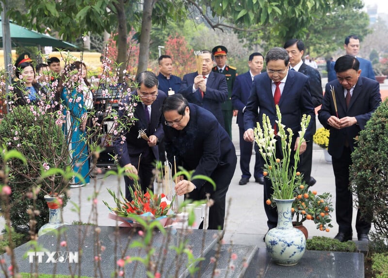 Thủ tướng Phạm Minh Chính dâng hương tưởng niệm các vị tiền bối cách mạng và các anh hùng, liệt sỹ tại Nghĩa trang Mai Dịch, Hà Nội. Ảnh: Văn Điệp/TTXVN