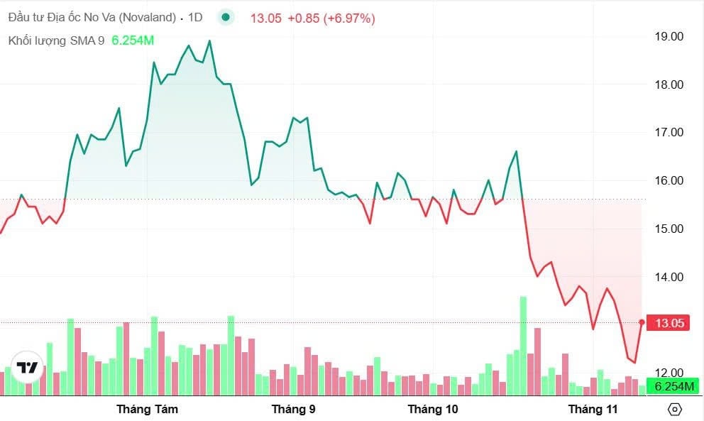 Phiên giao dịch ngày 12/11 chứng kiến VN-Index tiếp đà hồi phục mạnh, tăng 38 điểm lên 1.631 điểm, với thanh khoản vượt 21.000 tỷ đồng trên HoSE. Dòng tiền quay trở lại nhóm bất động sản, tạo hiệu ứng lan tỏa rõ nét khi hàng loạt cổ phiếu lớn nhỏ đồng loạt tăng mạnh, trong đó nổi bật là NVL của Tập đoàn Novaland (HoSE: NVL).