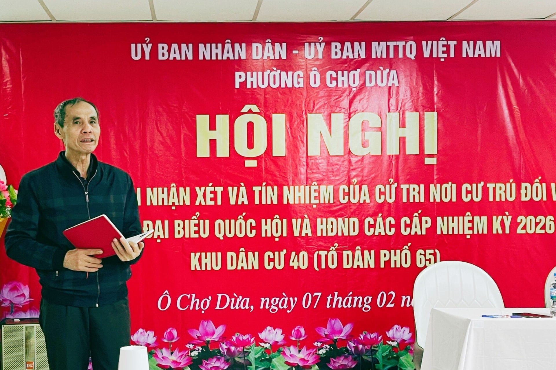 Hội nghị lấy ý kiến cử tri nơi cư trú đối với người được giới thiệu ứng cử đại biểu Quốc hội khóa XVI và đại biểu HĐND các cấp nhiệm kỳ 2026-2031 tại khu dân cư 40, tổ dân phố 65, phường Ô Chợ Dừa đã được tổ chức nghiêm túc, dân chủ, đúng quy định, bảo đảm phát huy quyền làm chủ của nhân dân trong công tác bầu cử.