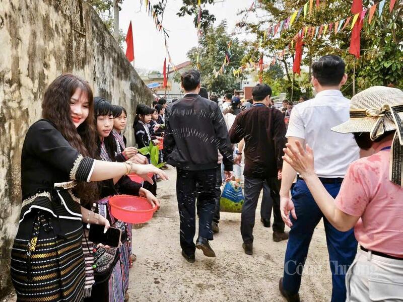 Bà con trong bản chờ đợi người dân và du khách để "tạt" nước đem đến điều may mắn cho một năm.