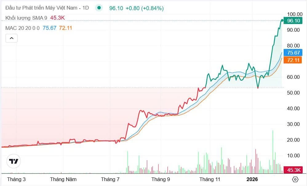 Phiên sáng 10/2, cổ phiếu VVS của Công ty CP Đầu tư Phát triển Máy Việt Nam (HOSE) tiếp tục duy trì đà tăng, có thời điểm nhích gần 3% lên 98.000 đồng/cổ phiếu, qua đó chính thức thiết lập vùng giá cao nhất kể từ khi niêm yết.