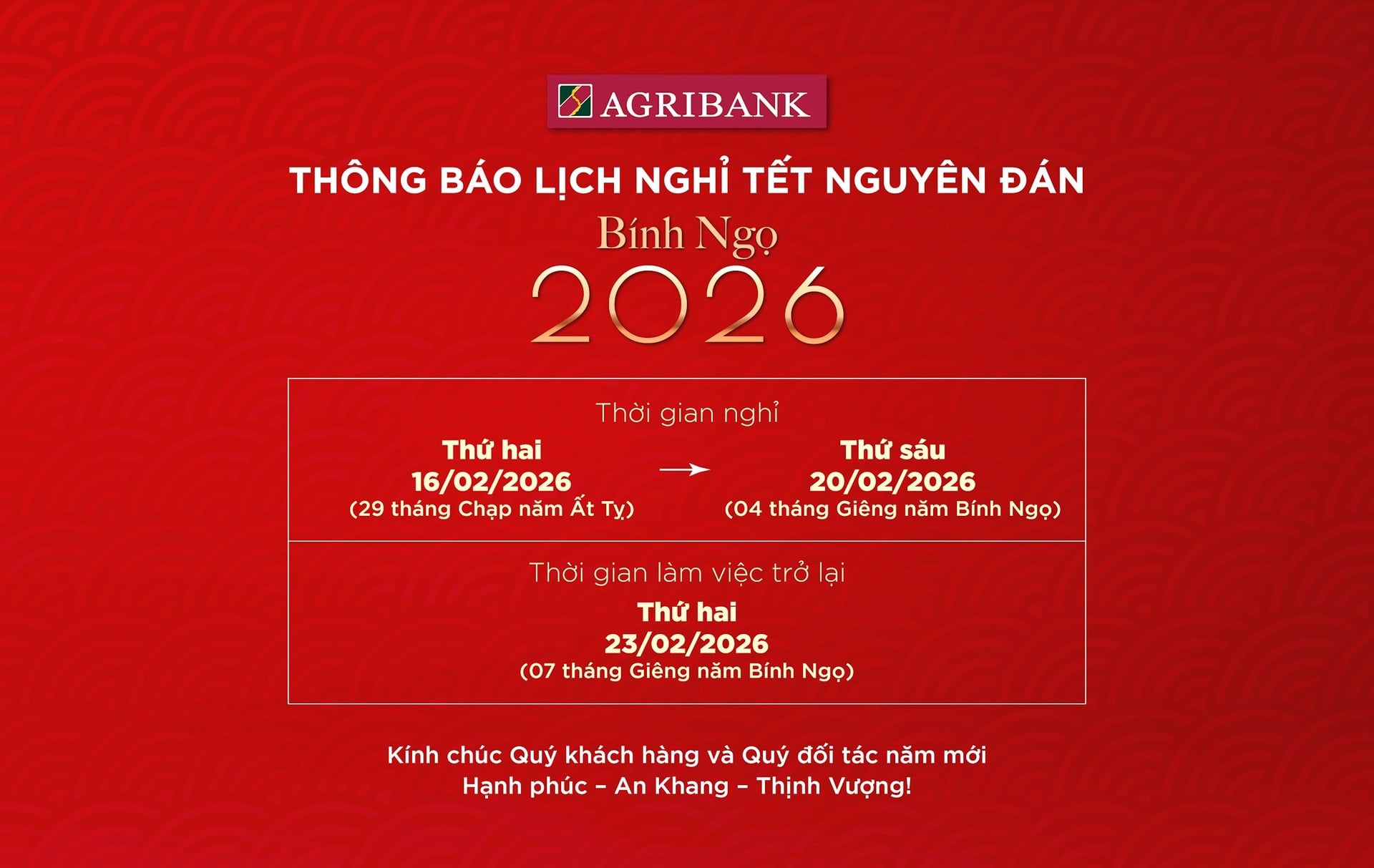 Agribank thông báo lịch nghỉ Tết Nguyên đán Bính Ngọ 2026 từ ngày 16/2/2026 đến hết Thứ sáu, ngày 20/2/2026 và sẽ làm việc trở lại từ ngày 23/2/2026.