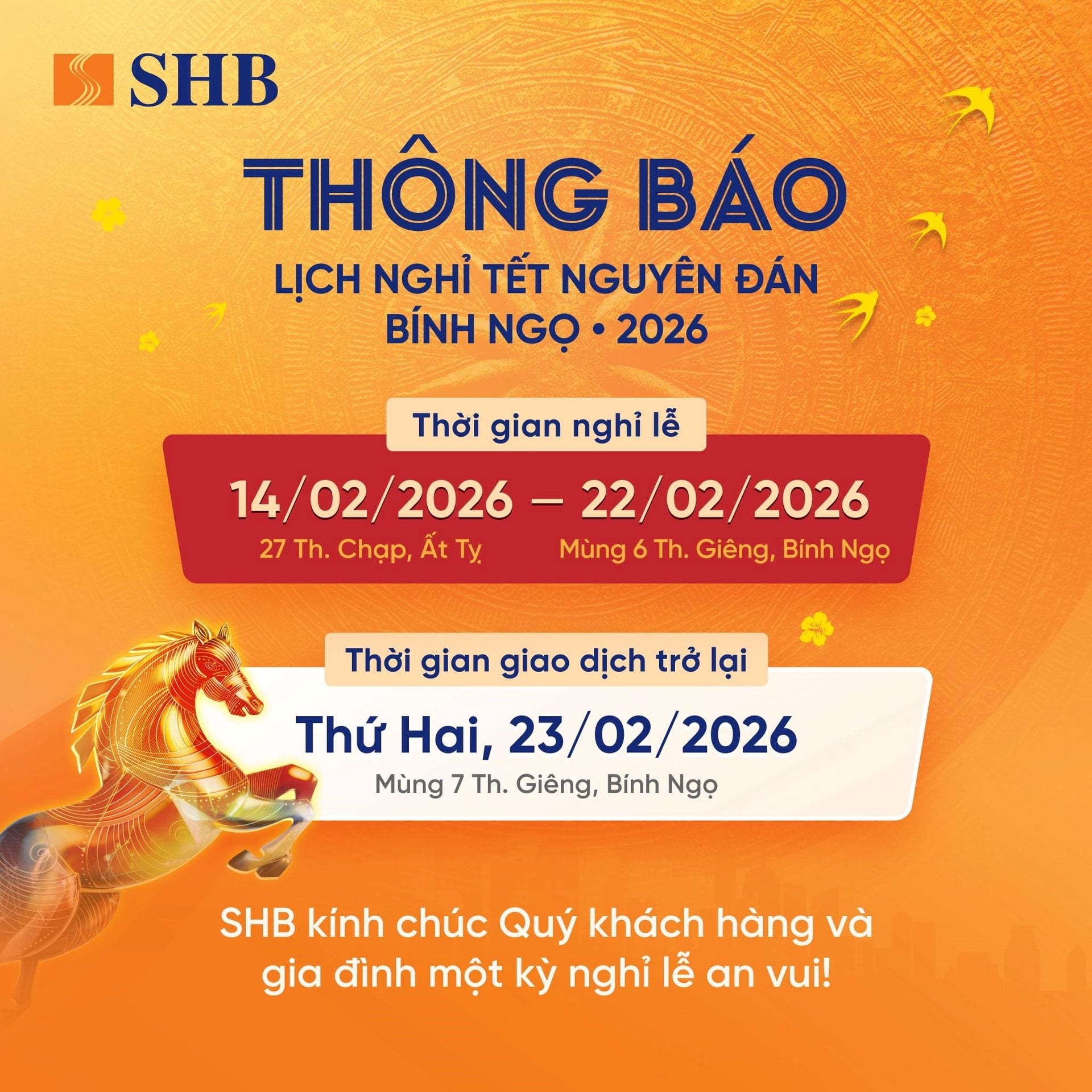 SHB thông báo lịch nghỉ Tết Nguyên đán 2026, theo đó ngân hàng sẽ tạm dừng giao dịch từ Thứ Bảy, ngày 14/2 đến hết Chủ Nhật, ngày 22/2/2026 và hoạt động trở lại từ Thứ Hai, ngày 23/2/2026.