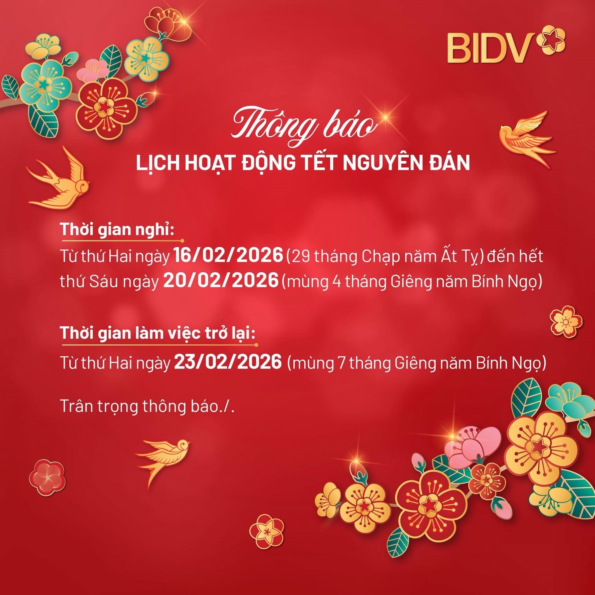 margin: 15px auto;" />BIDV cho biết, trong dịp Tết Nguyên đán Bính Ngọ 2026, các chi nhánh/phòng giao dịch của ngân hàng sẽ tạm dừng cung cấp dịch vụ trong 5 ngày, từ Thứ Hai ngày 16/02/2026 (tức 29 tháng Chạp năm Ất Tỵ) đến hết Thứ Sáu ngày 20/02/2026 (tức mùng 4 tháng Giêng năm Bính Ngọ).
