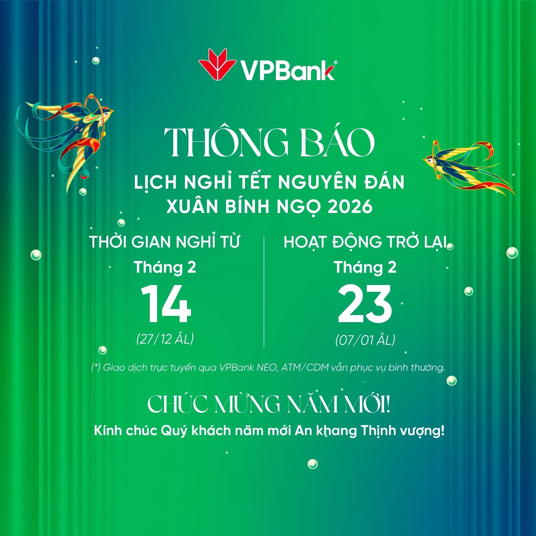 VPBank thông báo, nhằm tạo điều kiện để khách hàng chủ động sắp xếp giao dịch trong dịp Tết Nguyên đán Bính Ngọ, ngân hàng sẽ phục vụ giao dịch tại quầy đến 17h00 ngày 13/2/2026 (26 tháng Chạp âm lịch), nghỉ Tết từ ngày 14/2/2026 đến hết ngày 22/2/2026 và hoạt động trở lại bình thường từ ngày 23/02/2026 (mùng 7 tháng Giêng).