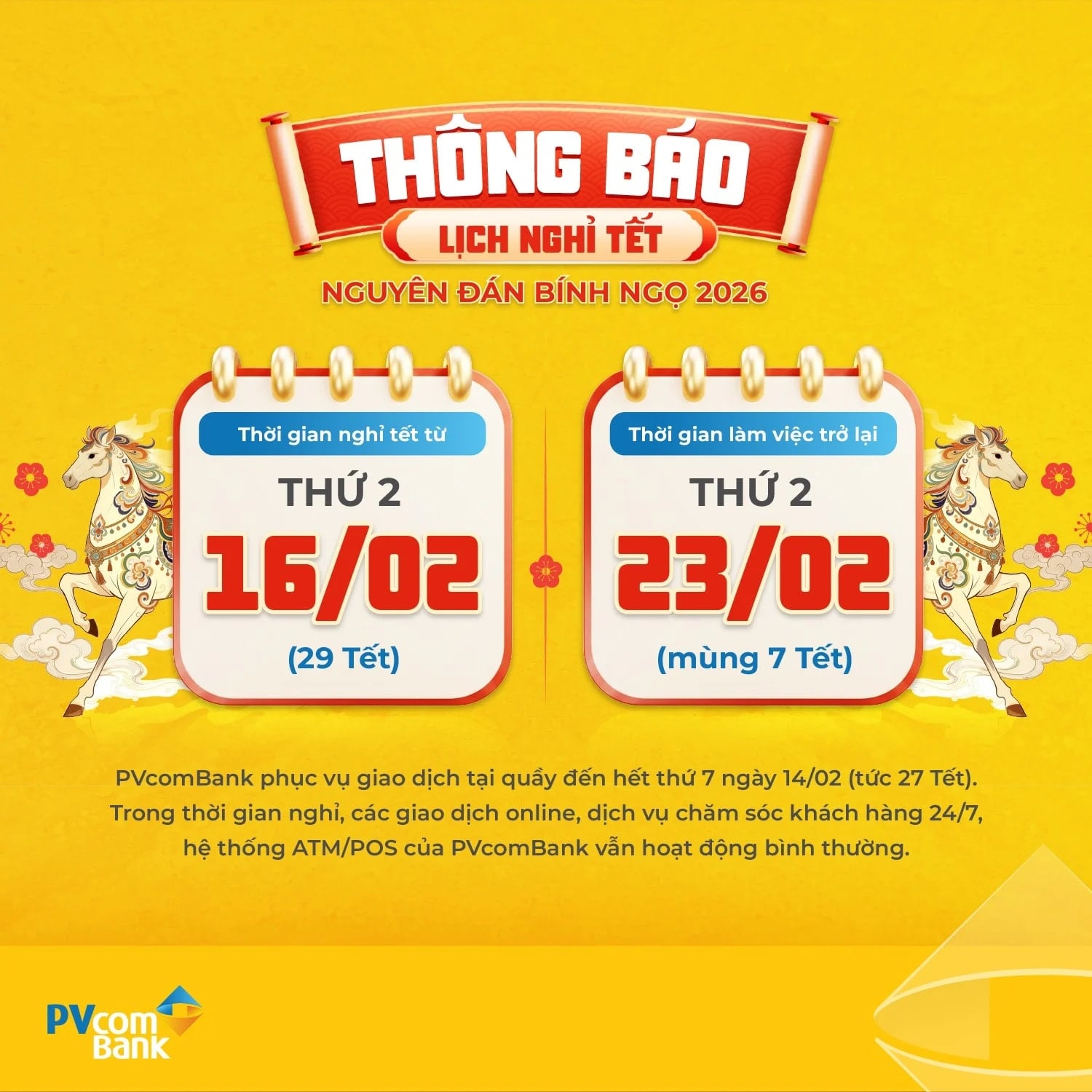 PVCombank cho biết vẫn duy trì cung cấp dịch vụ giao dịch tại quầy đến hết thứ Bảy ngày 14/2/2026 (27 Tết) tại 92 chi nhánh và phòng giao dịch trên toàn quốc.