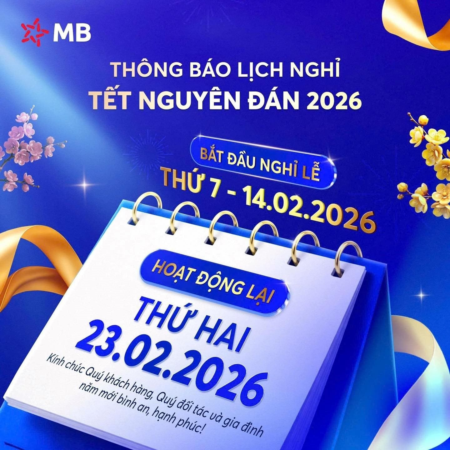 MB cho biết, các chi nhánh/phòng giao dịch của ngân hàng sẽ nghỉ Tết từ ngày 14/2/2026 đến hết ngày 22/2/2026 và làm việc trở lại từ ngày 23/2/2026.