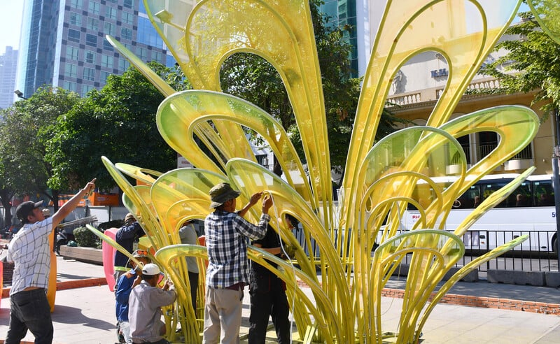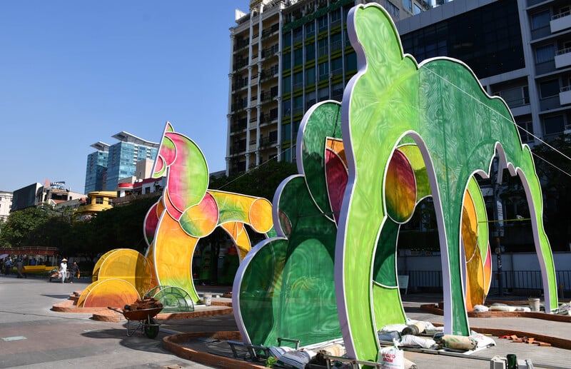 Không gian đường hoa xuân năm nay dần hiện rõ diện mạo, dù nhiều hạng mục vẫn đang trong quá trình hoàn thiện với nhiều lớp màu sắc, hình khối và chất liệu được bố trí dọc trục trung tâm, tạo không gian rực rỡ cho đường hoa Nguyễn Huệ xuân Bính Ngọ 2026. Ảnh: Thanh Minh