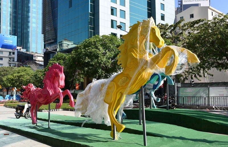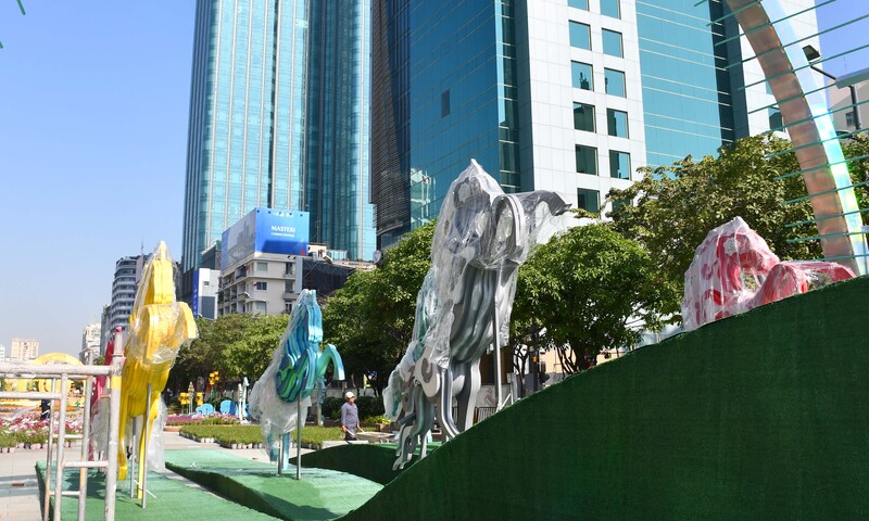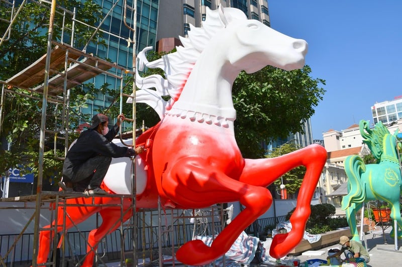 Công nhân phun sơn, hoàn thiện tạo hình tượng linh ngựa tại cuối đường hoa Nguyễn Huệ xuân Bính Ngọ 2026 - khu vực phía sông Bạch Đằng. Ảnh: Thanh Minh.