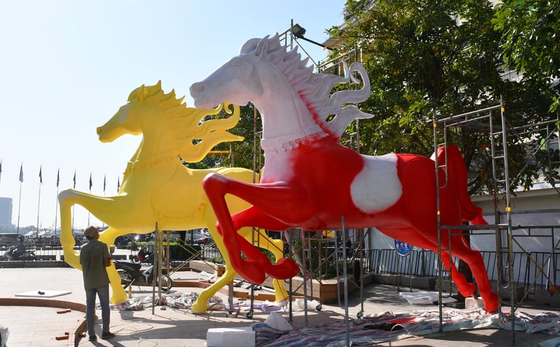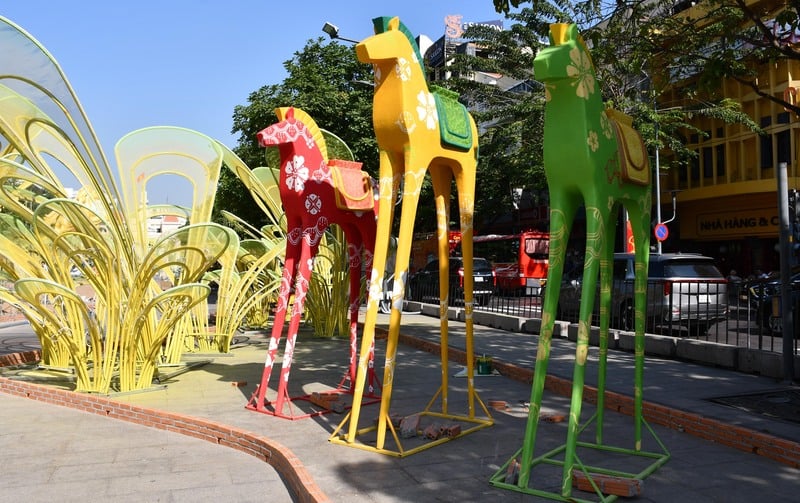 Điểm nhấn nổi bật nhất của đường hoa năm nay là các linh vật ngựa, biểu tượng của năm Bính Ngọ 2026 với thiết kế tạo hình đặc biệt lớn. Linh vật có chiều dài khoảng 9 m, chiều cao thân 7 m và tổng chiều cao khi lắp đặt lên đến 11 m. Hình tượng ngựa được thiết kế khỏe khoắn, sinh động, thể hiện tinh thần bứt phá, năng động và khát vọng vươn lên. Ảnh: Thanh Minh