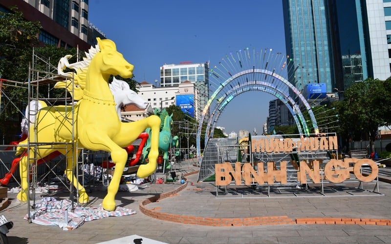 Biểu tượng linh vật Ngựa tại cổng chào đường hoa Nguyễn Huệ xuân Bính Ngọ 2026 đang được gấp rút thi công hoàn thiện, tạo điểm nhấn thị giác trên trục không gian chính của đường hoa. Ảnh: Thanh Minh