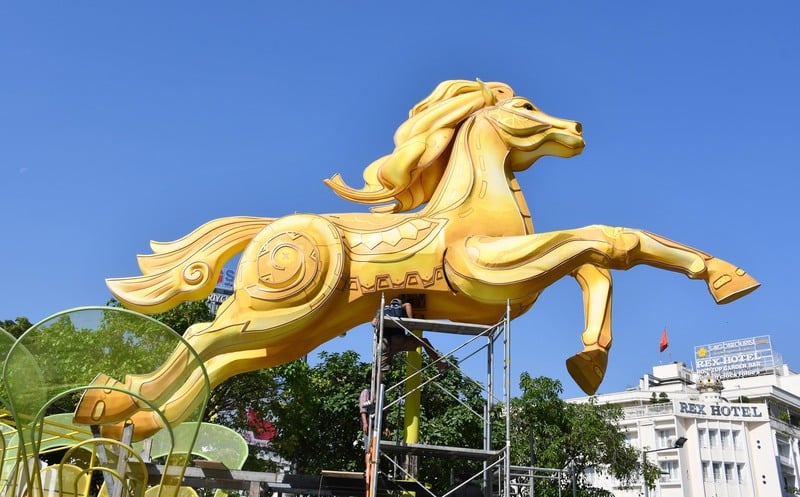 Biểu tượng “Nhất mã thong dong” - linh vật lớn nhất trong lịch sử đường hoa Nguyễn Huệ với chiều cao gần 7m đang được các công nhân gấp rút thi công hoàn thiện. Ảnh: Thanh Minh