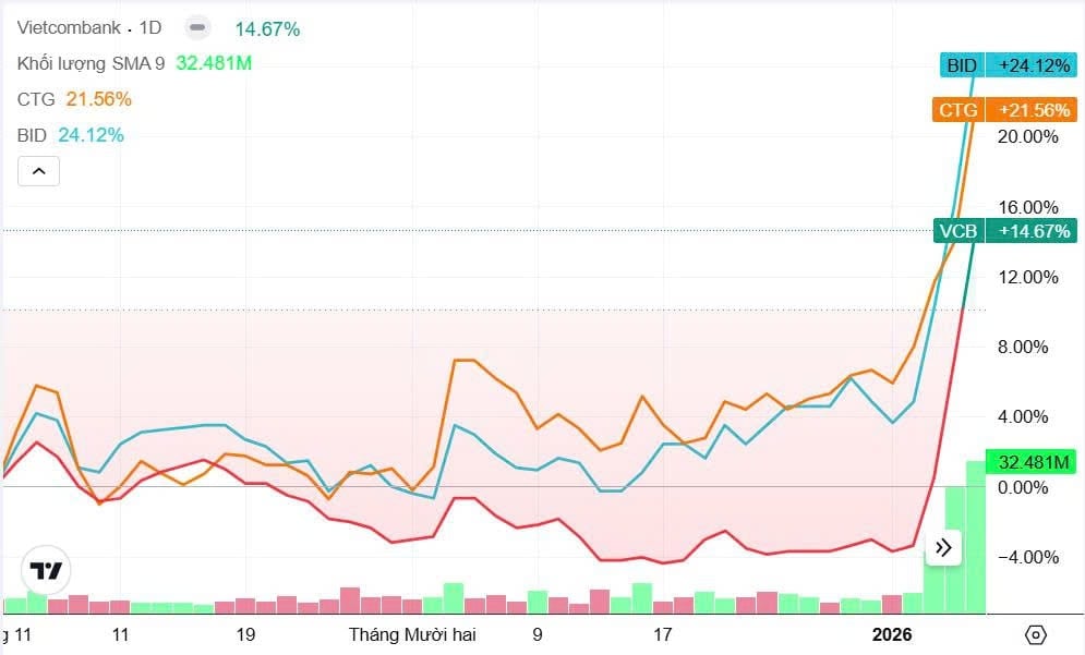 Tính chung cả tuần, cổ phiếu VCB tăng hơn 18%, đưa thị giá lên vùng cao nhất trong vòng 4 tháng. BID và CTG cũng không kém cạnh khi lần lượt tăng khoảng 18% và 14%.