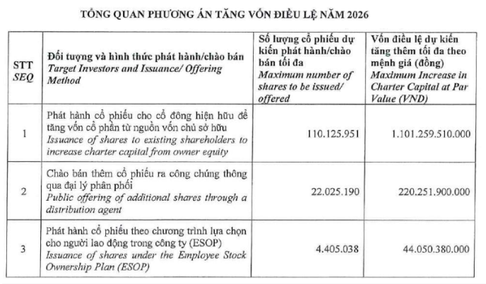 Kế hoạch tăng vốn được thực hiện thông qua ba phương án phát hành cổ phiếu. Trước hết, công ty dự kiến phát hành cổ phiếu thưởng cho cổ đông hiện hữu với tỷ lệ 1:1. Theo đó, cổ đông sở hữu một cổ phiếu sẽ nhận thêm một cổ phiếu mới. Tổng số cổ phiếu phát hành theo phương án này ước tính khoảng 110 triệu đơn vị.