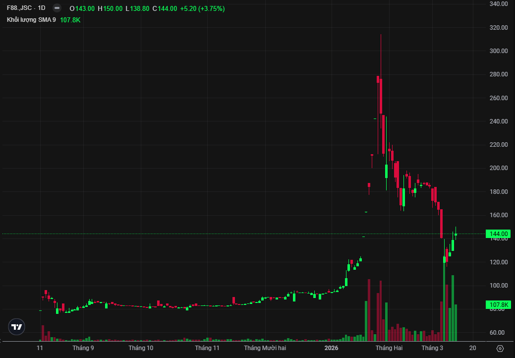 Kết thúc phiên giao dịch ngày 12/3/2026, cổ phiếu F88 tăng 3,75% đóng cửa ở mức giá 144.000 đồng. Thanh khoản ghi nhận 107.800 cổ phiếu được sang tay, với tổng giá trị khớp lệnh đạt 15.72 tỷ đồng.