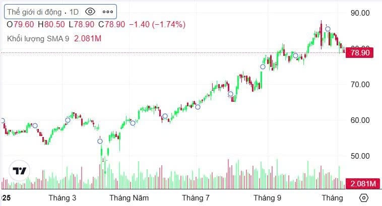 Trên sàn chứng khoán, cổ phiếu MWG vừa trải qua hai tuần điều chỉnh sau khi chạm đỉnh lịch sử 85.700 đồng/cp (sau điều chỉnh) trong phiên 23/10. Tính đến phiên 6/11, thị giá lùi về dưới 80.000 đồng/cp, tương đương mức giảm hơn 7%. Dù vậy, mã này vẫn thu hút dòng tiền mạnh từ khối ngoại và tự doanh chứng khoán – hai nhóm vốn đóng vai trò định hướng xu hướng giá trong ngắn hạn.