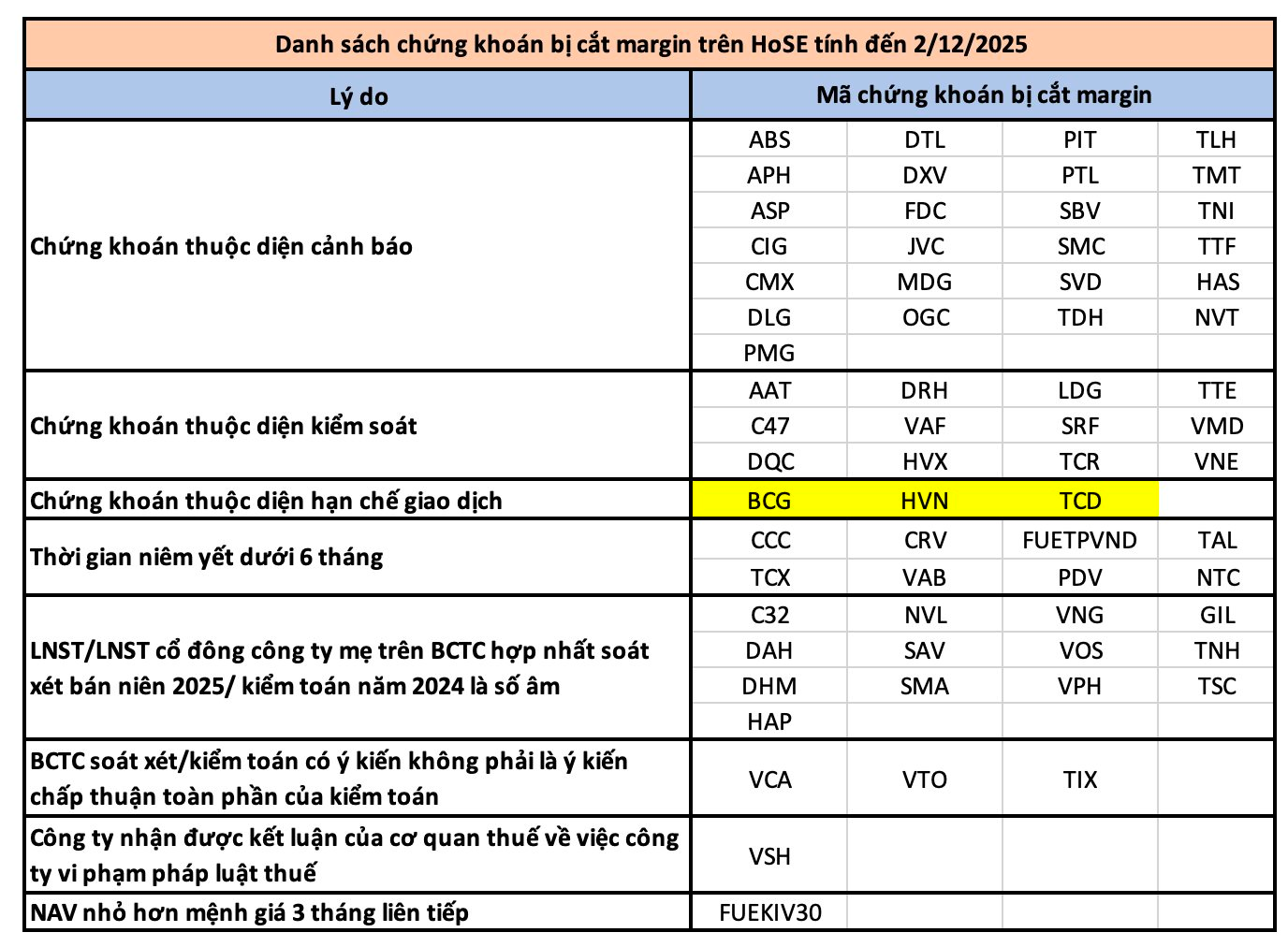 Tính đến ngày 2/12/2025, HoSE ghi nhận tổng cộng 66 mã nằm trong danh mục chứng khoán không đủ điều kiện ký quỹ. Danh sách này được xây dựng dựa trên nhiều tiêu chí gồm doanh nghiệp thuộc diện cảnh báo, kiểm soát, hạn chế giao dịch; báo cáo kiểm toán có ý kiến ngoại trừ; lợi nhuận sau thuế âm; hoặc thời gian niêm yết dưới 6 tháng. Nhiều mã quen thuộc tiếp tục góp mặt như BCG, HVN, NVL, LDG, OGC, TLH, NVT…, phản ánh tình trạng tài chính hoặc vấn đề kiểm toán tại các doanh nghiệp này.