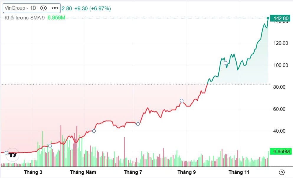Phiên giao dịch ngày 5/12/2025, cổ phiếu VIC của Tập đoàn Vingroup bật tăng kịch trần (+6,97%), thị giá đạt 142.000 đồng/cổ phiếu, khớp 7 triệu đơn vị và còn dư mua giá trần hơn 1 triệu cổ phiếu.