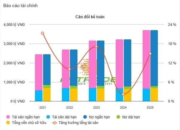 Tại thời điểm 31/12/2025, tổng tài sản của doanh nghiệp đạt khoảng 3.487 tỷ đồng, tăng so với mức hơn 3.000 tỷ đồng đầu năm, cho thấy quy mô hoạt động tiếp tục mở rộng. Trong đó, tài sản ngắn hạn chiếm tỷ trọng lớn với gần 2.989 tỷ đồng.