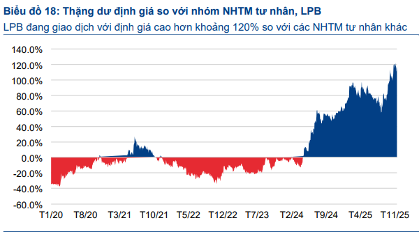 Theo Chứng khoán HSC, điểm đáng chú ý nhất của LPB hiện nay nằm ở định giá thị trường. Ngân hàng đang được giao dịch ở mức P/B dự phóng khoảng 2,8 lần, cao hơn đáng kể so với mức trung bình của nhóm ngân hàng tư nhân. Đây là mức định giá phản ánh kỳ vọng rất lớn vào khả năng duy trì hiệu quả sinh lời, trong khi hệ số ROE của LPB có thể đã tiến gần vùng đỉnh và đối mặt với rủi ro suy giảm theo chu kỳ chung của ngành.