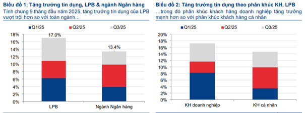 margin: 15px auto;" />Báo cáo mới cập nhật của Chứng khoán HSC ghi nhận lợi nhuận trước thuế 9 tháng 2025 của LPB tăng khoảng 9% so với cùng kỳ. Kết quả này có được nhờ chất lượng tài sản cải thiện và chi phí dự phòng được kiểm soát tương đối tốt. Tăng trưởng tín dụng đạt 17% tính đến cuối quý III, cao hơn bình quân ngành, với phần lớn dư nợ tăng thêm đến từ khách hàng doanh nghiệp. Song song với đó, chi phí hoạt động vẫn được duy trì ở mức hợp lý, giúp ngân hàng giữ được biên lợi nhuận cốt lõi.