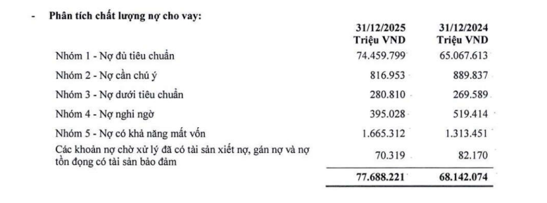 Trong đó, nợ dưới tiêu chuẩn (nhóm 3) đạt 280,8 tỷ đồng, tăng 4,2%; nợ nghi ngờ (nhóm 4) giảm 24%, xuống 395 tỷ đồng; trong khi nợ có khả năng mất vốn (nhóm 5) tăng mạnh 26,8%, lên 1.665,3 tỷ đồng. Tuy vậy, nhờ dư nợ tín dụng tăng trưởng cao, tỷ lệ nợ xấu nội bảng của ngân hàng giảm nhẹ từ 3,09% xuống khoảng 3% vào cuối năm 2025.