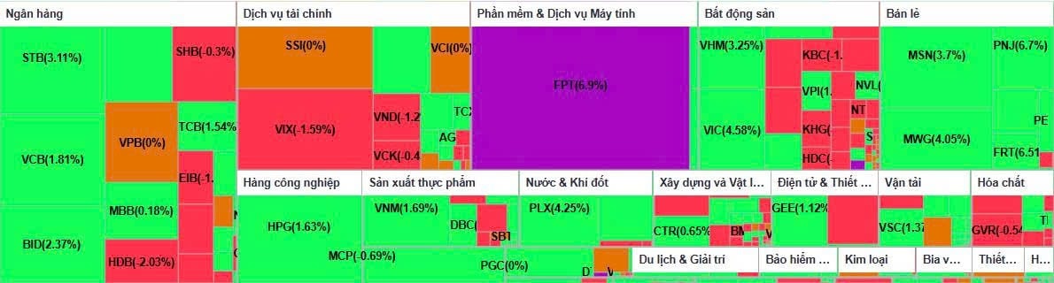 Bên cạnh đó, nhiều cổ phiếu lớn khác cũng giao dịch tích cực. STB, MSN, PLX và MWG tăng từ hơn 3% đến trên 4%. Các mã TCB, HPG, VNM, VJC, VCB, GAS và BID tăng quanh mức 1–2%, góp phần củng cố đà tăng chung.