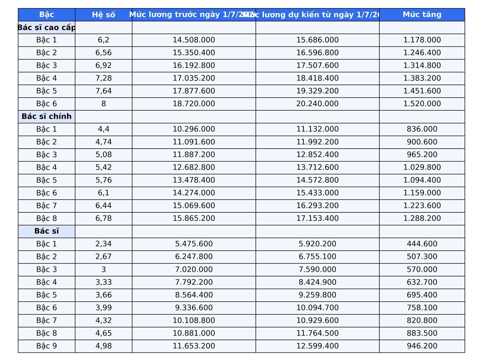 Với mức lương cơ sở dự kiến là 2,53 triệu đồng thì bảng lương của bác sĩ từ 1/7 sẽ được dự tính như sau: