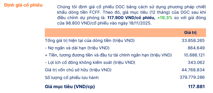 Với triển vọng tích cực từ cả dự án bất động sản Đức Giang và tổ hợp Hóa chất Nghi Sơn, SHS Research duy trì khuyến nghị khả quan đối với cổ phiếu DGC. Giá mục tiêu được đưa ra là 117.900 đồng/cổ phiếu trong 12 tháng tới, tương ứng mức tăng kỳ vọng 19,3% so với giá đóng cửa 98.800 đồng ngày 18/11/2025.