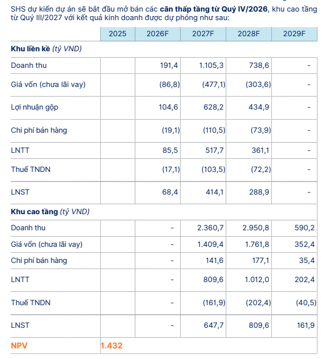 Tuy nhiên, báo cáo cập nhật của SHS Research cho thấy triển vọng tích cực hơn đáng kể. Theo đơn vị phân tích, khu thấp tầng sẽ bắt đầu mở bán từ quý IV/2026, mang về 2.035 tỷ đồng doanh thu và 771 tỷ đồng lãi ròng trong giai đoạn 2026-2028. Khu cao tầng được dự báo mở bán từ quý III/2027 với tổng doanh thu 5.902 tỷ đồng và lãi sau thuế 1.619 tỷ đồng trong giai đoạn 2027-2029.