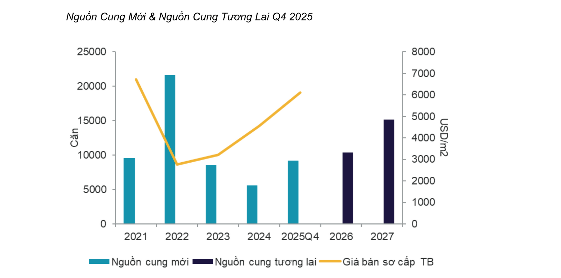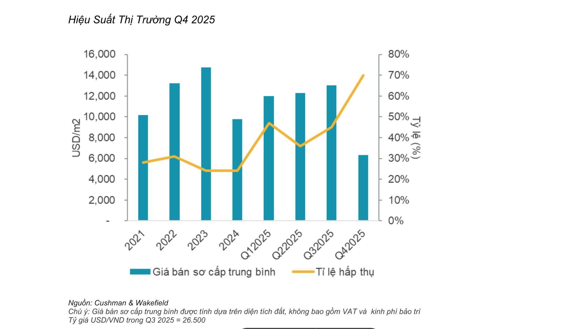 Theo Cushman & Wakefield, trong quý IV/2025, giá bán sơ cấp căn hộ trung bình đạt khoảng 6.113 USD/m2, tăng mạnh khoảng 16% so với quý III/2025 và tăng khoảng 65% so với cùng kỳ năm 2024, do các dự án mới luôn có định vị cao hơn dự án cũ.