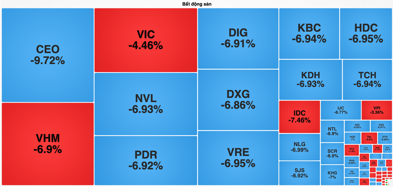 Rất nhiều mã trụ cột nhóm ngân hàng, bất động sản, bán lẻ giảm giá. Trong đó, Techcombank (TCB) giảm sàn 2.800 đồng xuống 37.850 đồng/cp. VPBank (VPB) giảm sàn 2.200 đồng xuống 29.750 đồng/cp. MBBank (MBB), HDBank (HDB), Ngân hàng Sài Gòn - Hà Nội (SHB), Sacombank (STB), TPBank (TPB), VIBank (VIB) đồng loạt giảm hết biên độ.