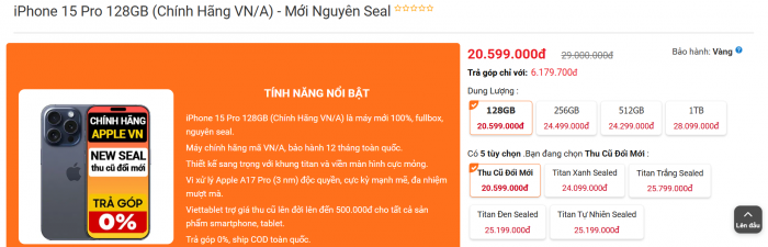 margin: 15px auto;" />Sau khi dòng iPhone 17 chính thức bán ra, iPhone 14 Pro và 14 Pro Max đã biến mất hoàn toàn khỏi kệ hàng. Điều này khiến iPhone 15 Pro trở thành chiếc iPhone Pro nhỏ gọn giá rẻ nhất đang được bán mới tại Việt Nam. Đây cũng là model Pro cuối cùng của Apple duy trì thiết kế nhỏ 6.1 inch, trọng lượng nhẹ nhưng vẫn mang cấu hình mạnh mẽ gần như tương đương các flagship lớn.