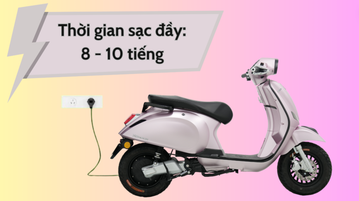 Xe sử dụng bộ ắc quy chì kín khí 60V – 20Ah (5 bình 12V), cho nguồn điện ổn định và dễ thay thế khi cần. Thời gian sạc đầy khoảng 8–10 giờ với bộ sạc tiêu chuẩn, phù hợp với thói quen sạc qua đêm của đa số người dùng.