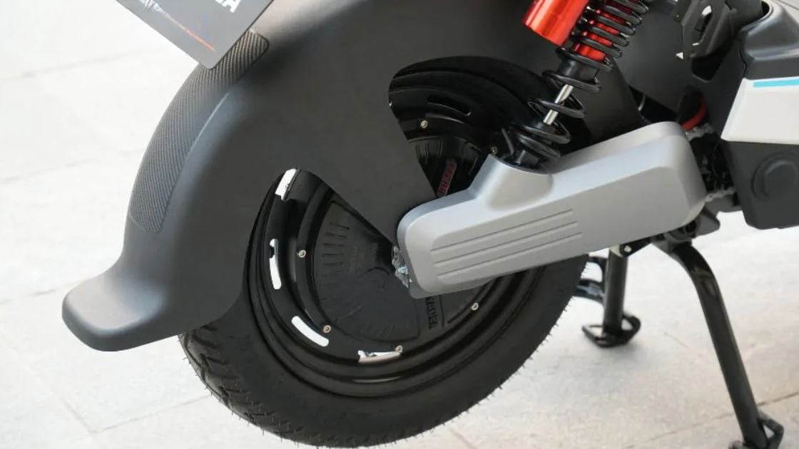 Một điểm đáng chú ý là cấu hình bánh trước 14 inch và bánh sau 12 inch, kết hợp lốp không săm bản rộng. Thiết kế này giúp tăng độ bám đường và cải thiện khả năng vận hành ổn định hơn so với các mẫu xe điện nhỏ gọn thông thường.
