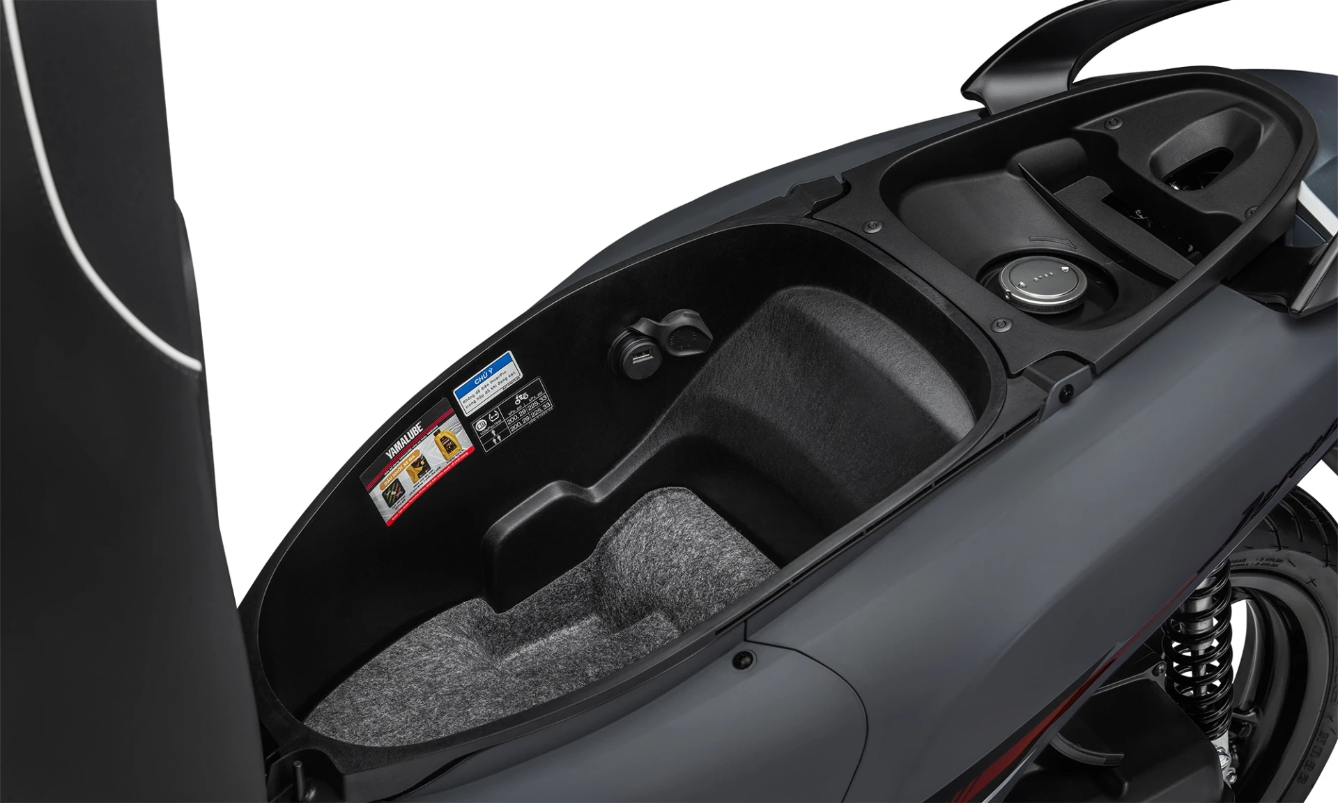 Sàn để chân rộng hơn 20 mm giúp tư thế ngồi thoải mái, đặc biệt với người có chiều cao trung bình. Cốp dưới yên tăng thêm 1,1 lít, đạt dung tích 15,3 lít, đủ để chứa mũ bảo hiểm nửa đầu và nhiều vật dụng cá nhân. Yamaha cũng tích hợp cổng sạc USB trong cốp nhằm đáp ứng nhu cầu sạc điện thoại khi di chuyển.